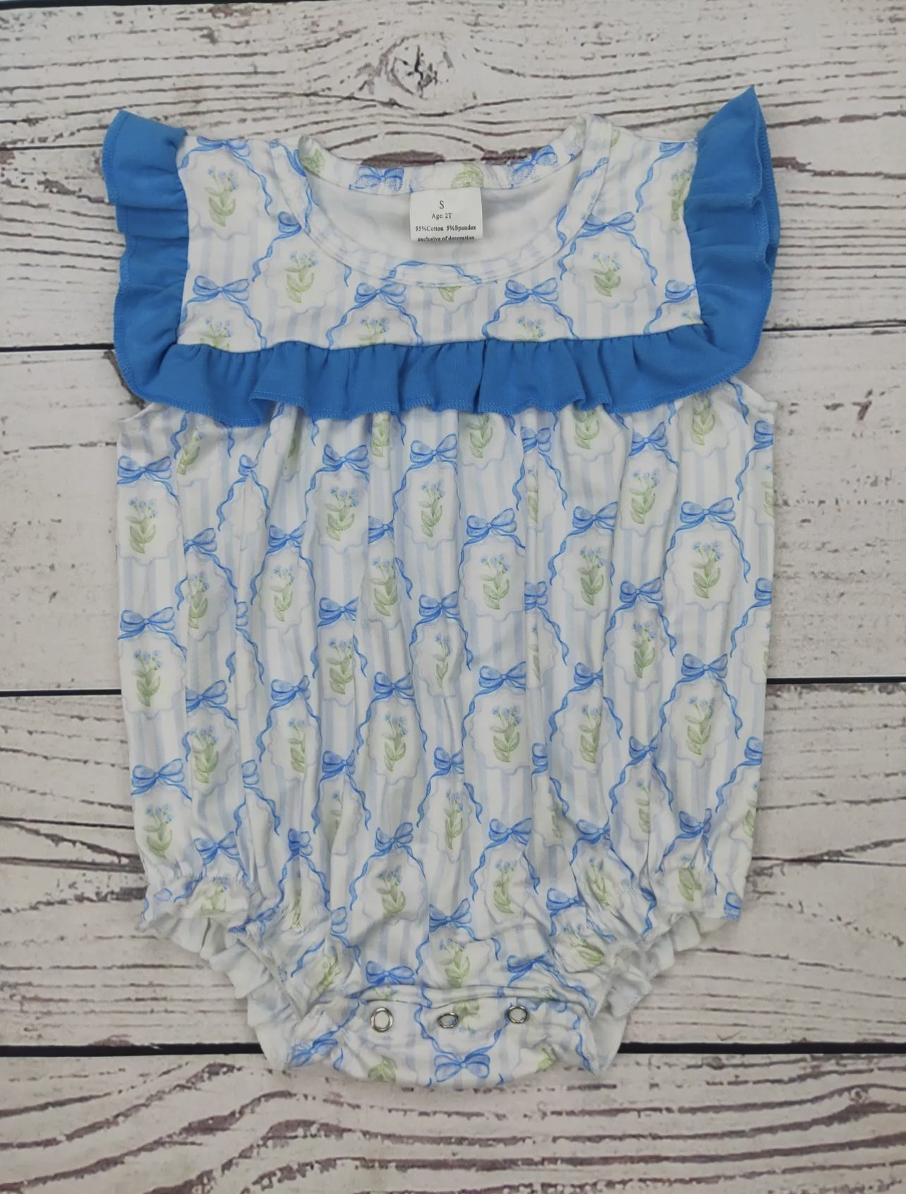 Shop › Blue Petal Bow Romper Image 1 of 1 Blue Petal Bow Romper $18.00 Size: 0-3m 3-6m 6-12m 12-18m 2t Quantity: Add To Cart Added!